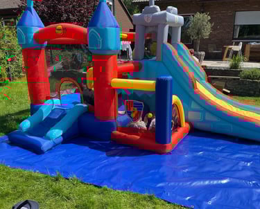 Hüpfburg mit Rutsche, Sprungbereich und kleinem Bällebad im Märchenwalddesign