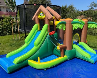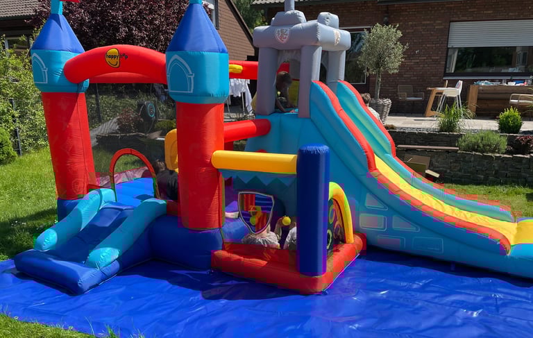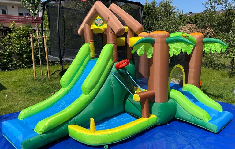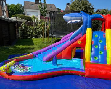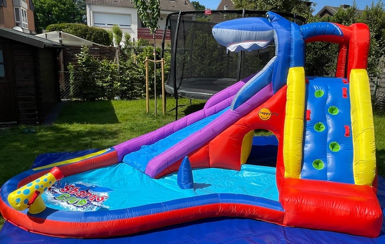Perfekt für heiße Tage: Splash-Hüpfburg mit Rutsche und Wasserspielbereich. Mit Anschluss an den Gartenschlauch spritzt Wasser von der Kanone und von den Haizähnen.
